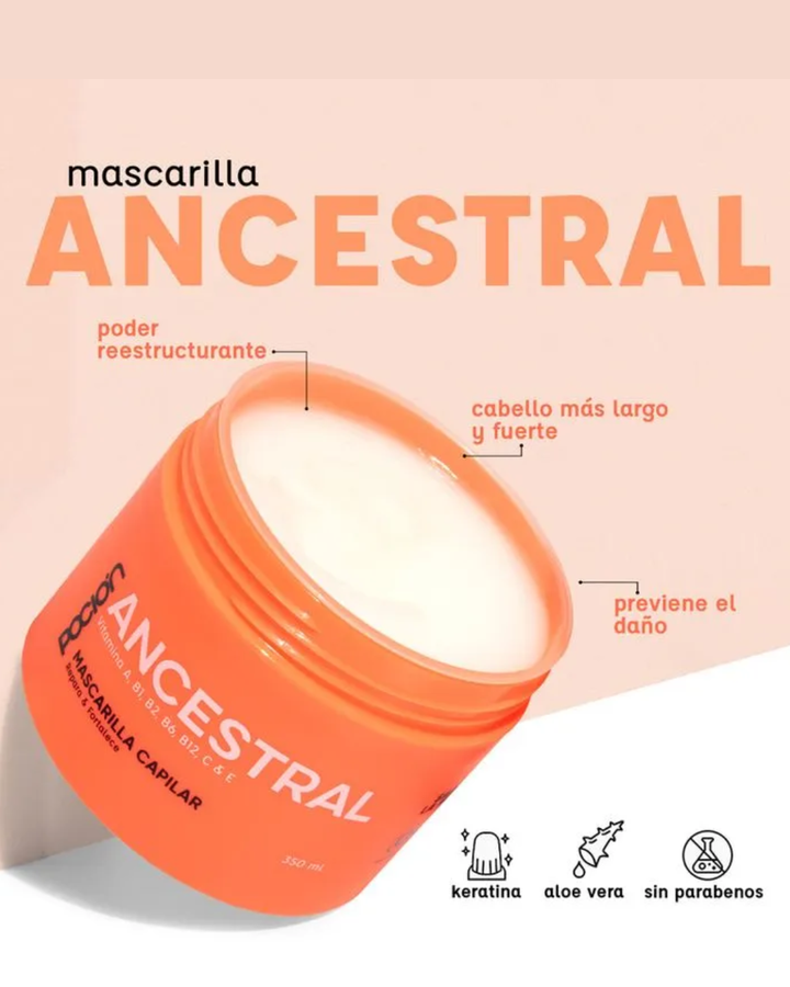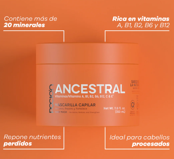 Mascarilla ANCESTRAL la poción fue creada para cabellos sobreprocesados de todas las texturas y para los que deseen mejorar y llevar sus hebras a otro nivel de belleza y salud.