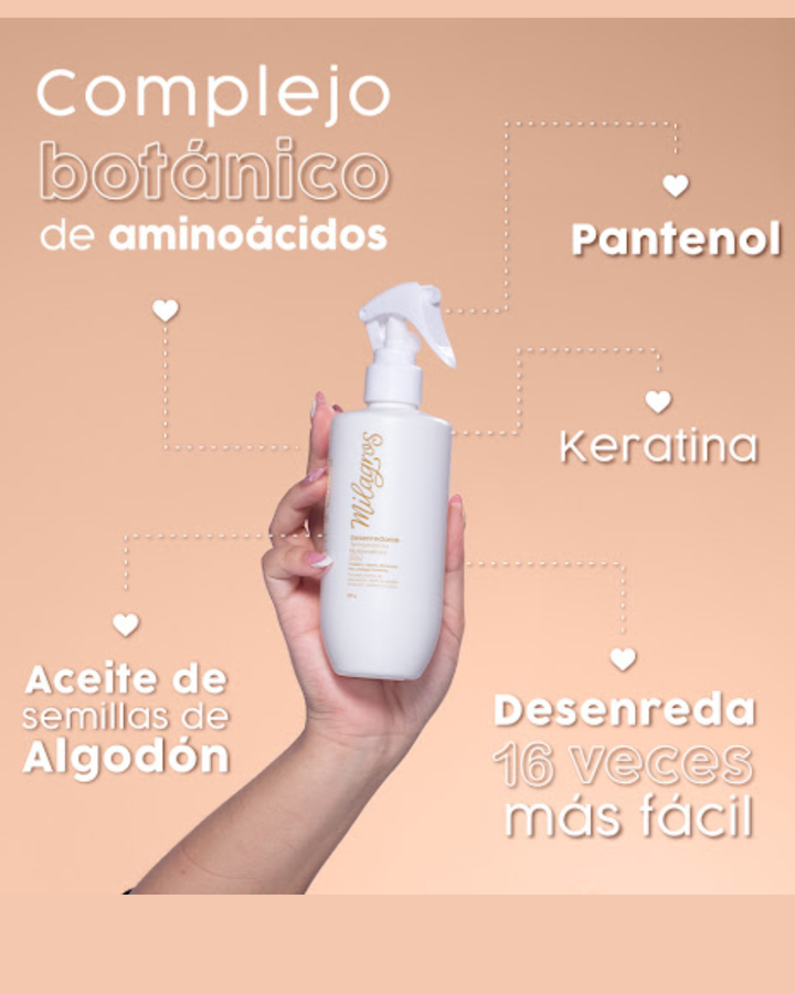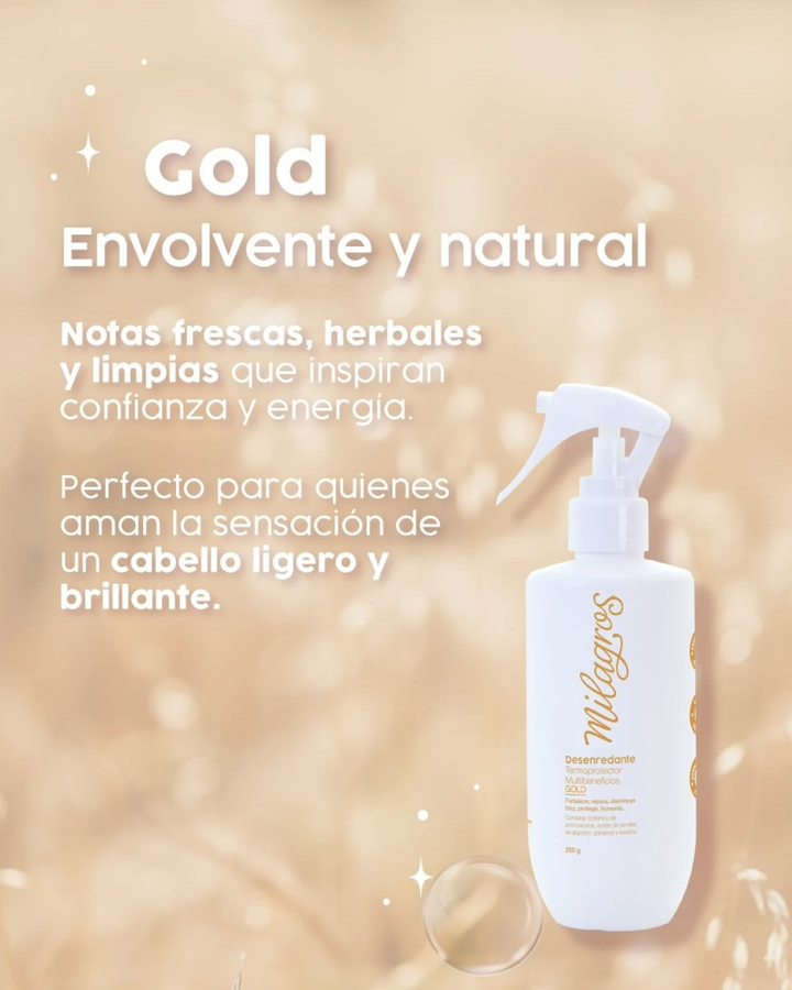 El Desenredante Gold Milagros es un tratamiento capilar termoprotector formulado para mejorar la manejabilidad del cabello, facilitar el peinado y reducir el frizz.