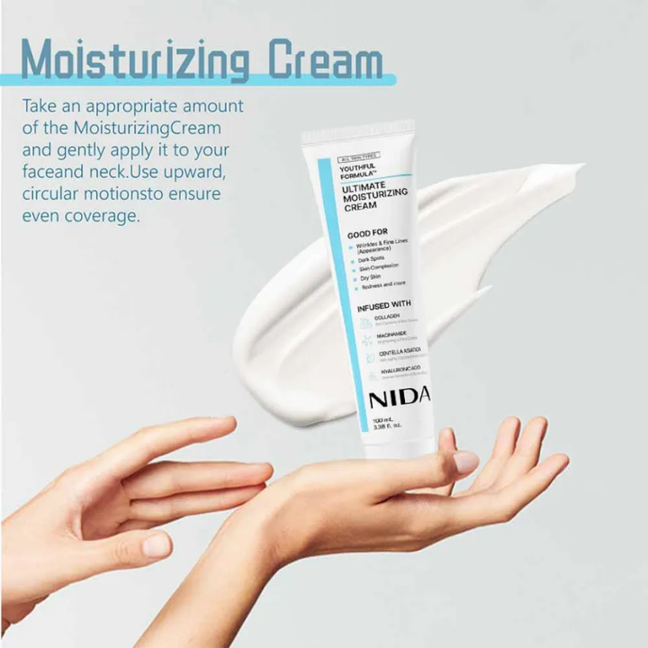 La Crema Hidratante Diaria NIDA [Youthful Formula] es un tratamiento facial avanzado diseñado para brindar hidratación intensa, nutrición profunda y efecto antiedad visible.